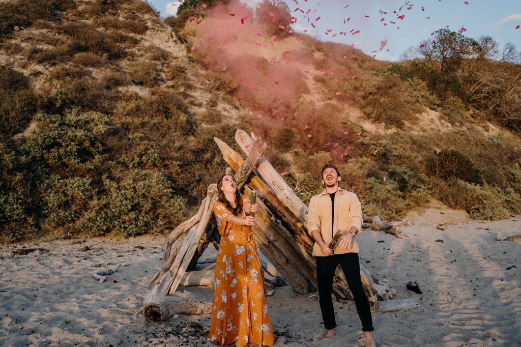 If you decide to wait a few days before you find out like we did, I suggest putting them in a bag in the back seat of your car until you need them. Basically I forgot about them and they weren’t inside the house tempting us to look inside that envelope – out of sight, out of mind. To sum it up, we popped the cannons with friends and family, finding out in this beautiful moment together what Baby Sopak will be…